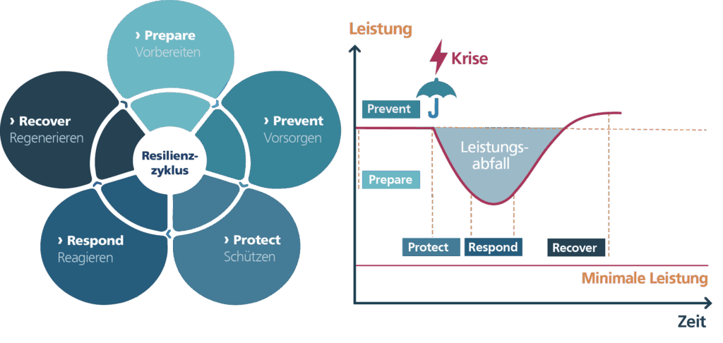 Das Resilienzkonzept gliedert sich in fünf zyklische Phasen: Prepare, Prevent, Protect, Respond und Recover. Diese Phasen strukturieren den zeitlichen Umgang mit disruptiven Ereignissen: